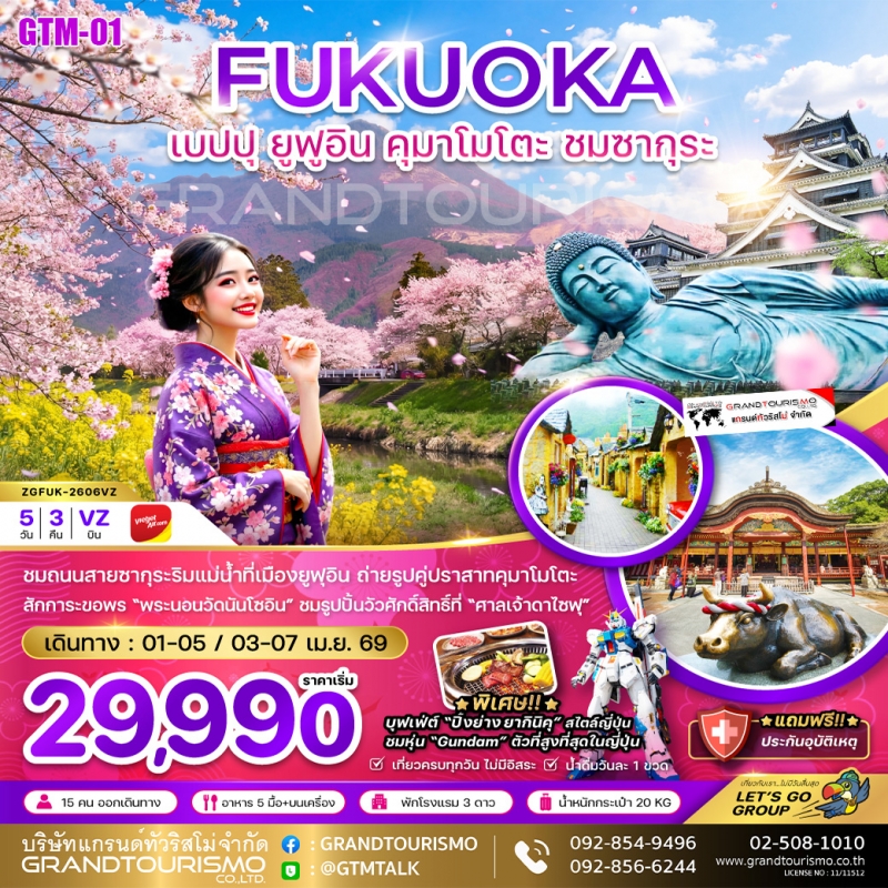 ทัวร์ญี่ปุ่น ฟุกุโอกะ เบปปุ ยูฟูอิน คุมาโมโตะ ชมซากุระ 5วัน3คืน เม.ย.69 BY VZ