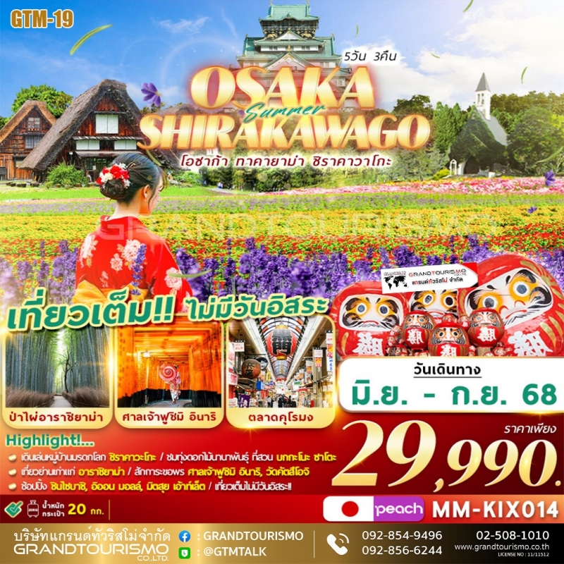 ทัวร์ญี่ปุ่น โอซาก้า ทาคายาม่า ชิราคาวาโกะ ปราสาทโอซาก้า วัดคัตสึโอจิ 5วัน3คืน มิ.ย-ก.ย.68