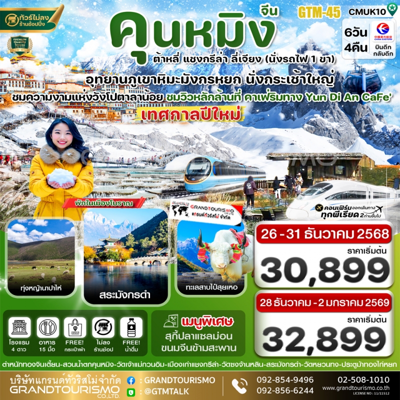 ทัวร์จีน คุนหมิง ไม่ลงร้าน ต้าหลี่ แชงกรีล่า ลี่เจียง สวนน้ำตกคุนหมิง ภูเขาหิมะมังกรหยก ช่องแคบเสือกระโจน วัดซงจ้านหลิน รถไฟความเร็วสูง 6 วัน 4 คืน ธ.ค. 68
