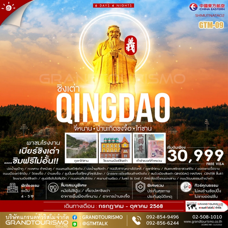 ทัวร์จีน จี่หนาน ไม่ลงร้านช้อป บ้านขงจื้อ ไท่ซาน ชิงเต่า ยอดเขาอวี้ฮวาง บ่อน้ำเป้าทู หนานเทียนเหมิน เมืองไท่อัน 6 วัน 4 คืน ก.ต.-ต.ค. 68