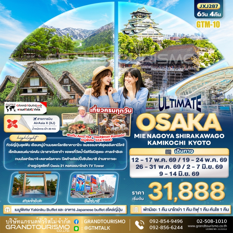 ทัวร์ญี่ปุ่น โอซาก้า ปราสาทโอซาก้า มิเอะ นาโกย่า ศาลเจ้าอิเสะ ชิราคาวาโกะ คามิโคจิ เกียวโต วัดคิโยมิสุเดระ ชินไซบาชิ 6 วัน 4 คืน พ.ค.-มิ.ย. 69