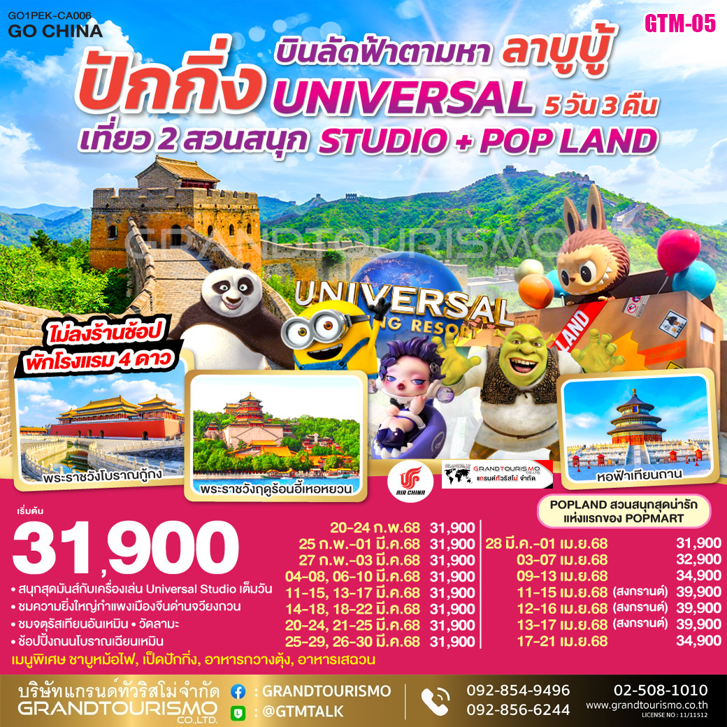 ทัวร์จีน ปักกิ่ง UNIVERSAL STUDIO + POP LAND (ทัวร์ปักกิ่งไม่ลงร้าน) 5วัน3คืน ก.พ.-เม.ย.68
