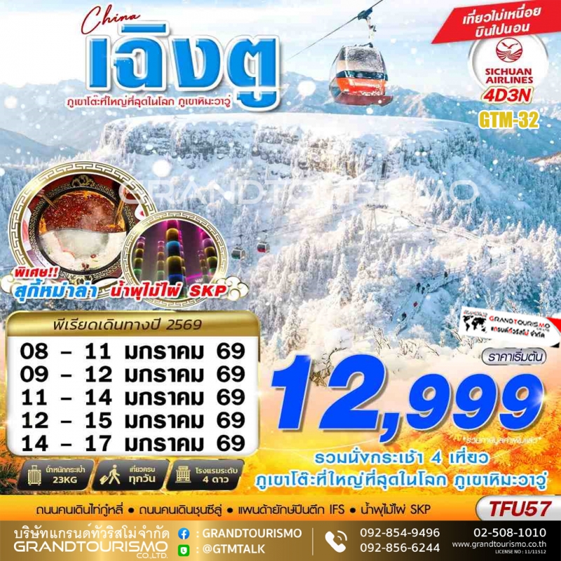 ทัวร์จีน เฉิงตู ภูเขาหิมะวาวู่ ขึ้นกระเช้าชมภูเขาโต๊ะ ชมแสงสียามค่ำคืนน้ำพุไม้ไผ่ SKP วัดต้าฉือ แพนด้ายักษ์ปีนตึก IFS 4 วัน 3 คืน ม.ค. 69