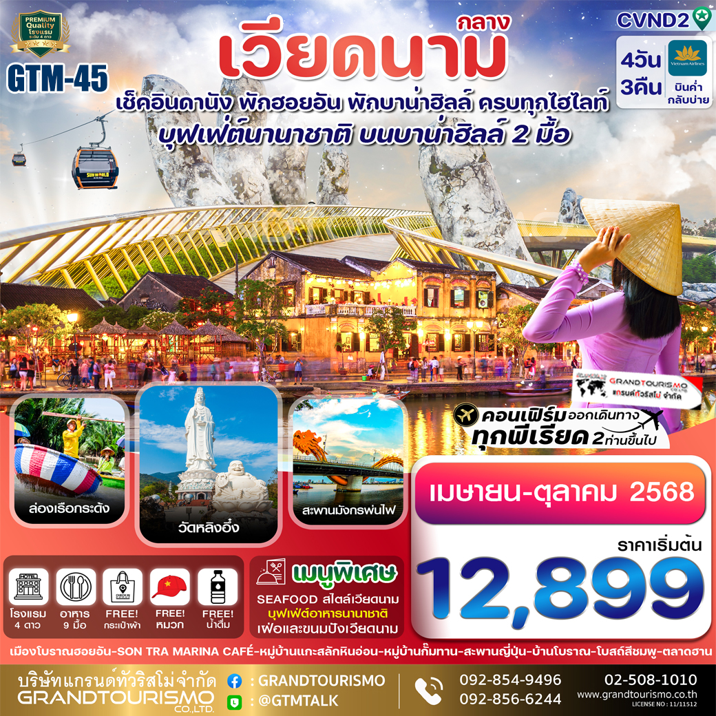 ทัวร์เวียดนาม เวียดนามกลาง ดานัง ฮอยอัน (พักบานาฮิลล์1คืน) 4วัน3คืน เม.ย.-ต.ค.68