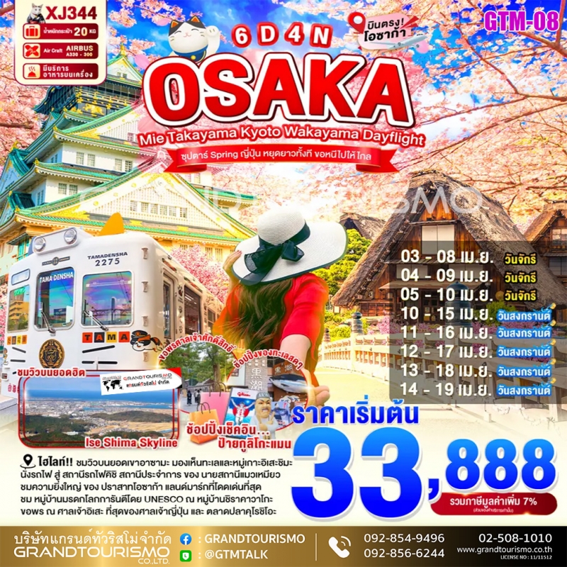ทัวร์ญี่ปุ่น โอซาก้า ชิราคาวาโกะ นาโกย่า เกียวโต สถานีแมว ตลาดปลาคุโรชิโอ ชินไซบาชิ 6วัน4คืน เม.ย.69 BY XJ