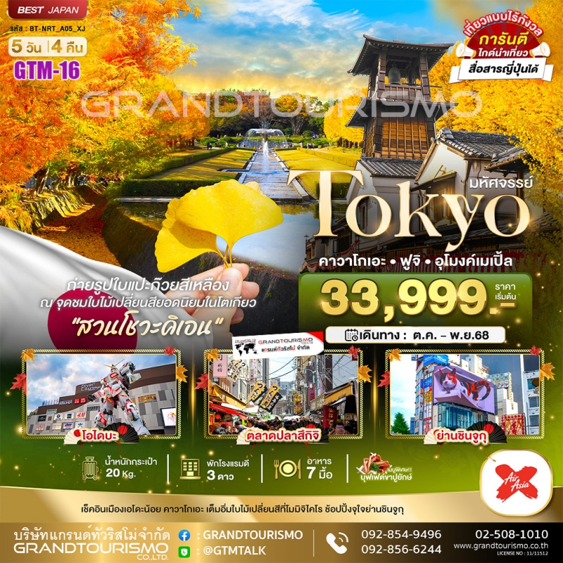 ทัวร์ญี่ปุ่น โตเกียว คาวาโกเอะ ฟูจิ อุโมงค์เมเปิ้ล สวนโชวะคิเอน (อิสระ1วัน) 5วัน4คืน พ.ย.68