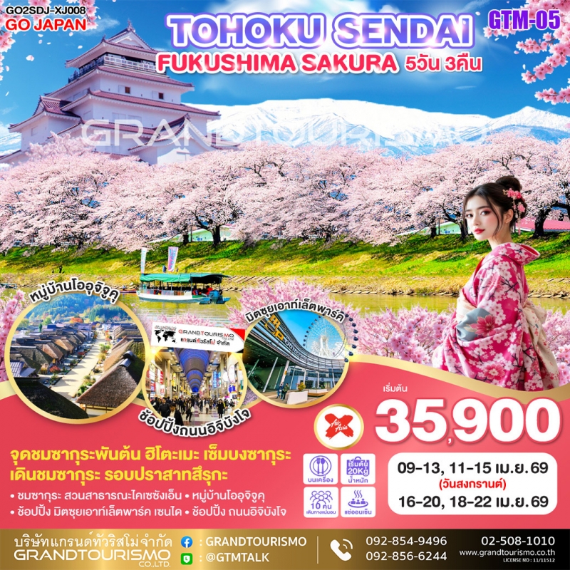 ทัวร์ญี่ปุ่น เซนได ซากุระ มิยางิ ซากุระพันต้น ปราสาทสึรุกะ หมู่บ้านโออุจิจูคุ ไคเซซังเอ็น ไอสึวากะมัตสึ 6วัน4คืน เม.ย.69