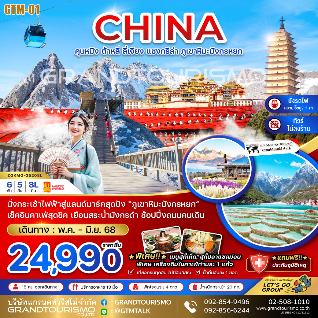 ทัวร์จีน คุนหมิง ต้าหลี่ ลี่เจียง แชงกรีล่า ภูเขาหิมะมังกรหยก (นั่งรถไฟ-ไม่ลงร้าน) 6วัน5คืน พ.ค.-มิ.ย.68