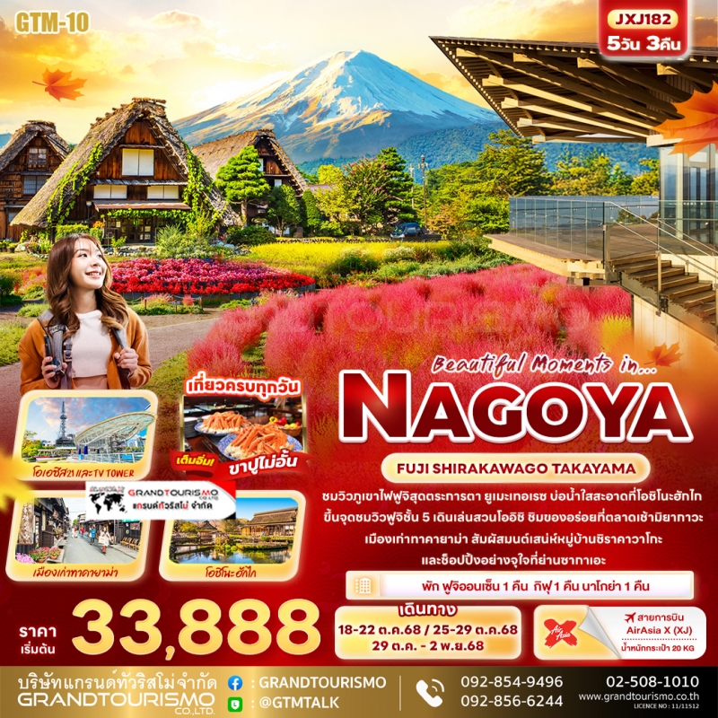 ทัวร์ญี่ปุ่น นาโกย่า ฟูจิ ทาคายาม่า ชิราคาวาโกะ โอชิโนะฮักไก กิฟุ ออนเซ็น บุฟเฟ่ต์ขาปูยักษ์ หมู่บ้านโอชิโนะฮักไก สวนโออิชิ 5 วัน 3 คืน ต.ค. 68
