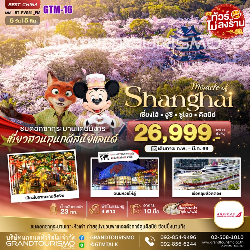 ทัวร์จีน เซี่ยงไฮ้ ดิสนีย์แลนด์ (อิสระ1วัน) (ไม่ลงร้าน) อู๋ซี ซูโจว นอร์ธบันด์ หาดไว่ทาน อู่คัง 6วัน5คืน ก.พ.-มี.ค.69 BY FM