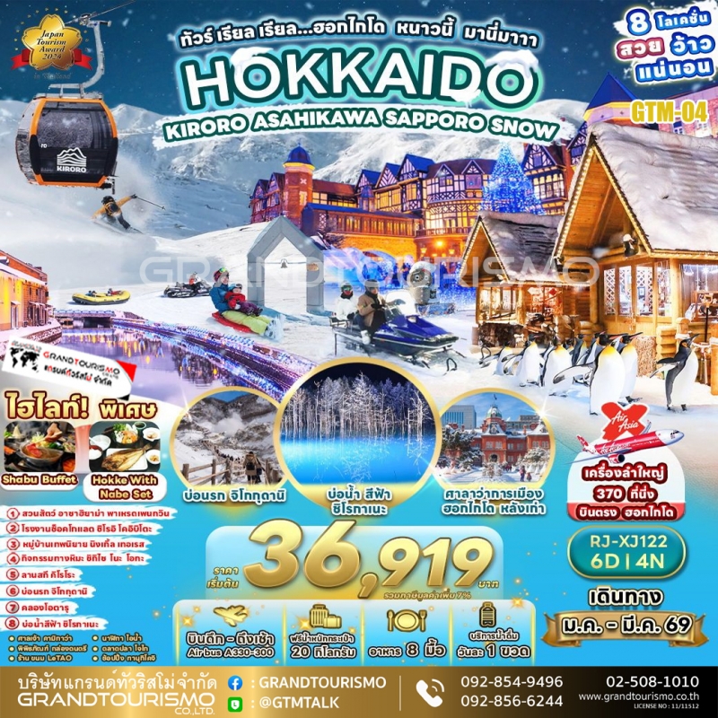ทัวร์ญี่ปุ่น ฮอกไกโด ซัปโปโร หุบเขานรกจิโกกุดานิ ฟุราโน่ นิงเกิ้ลเทอเรส สวนสัตว์อาซาฮิยาม่า บ่อน้ำสีฟ้า ลานสกีคิโรโระ หมู่บ้านราเมน โอตารุ 6 วัน 4 คืน ม.ค. - มี.ค. 69