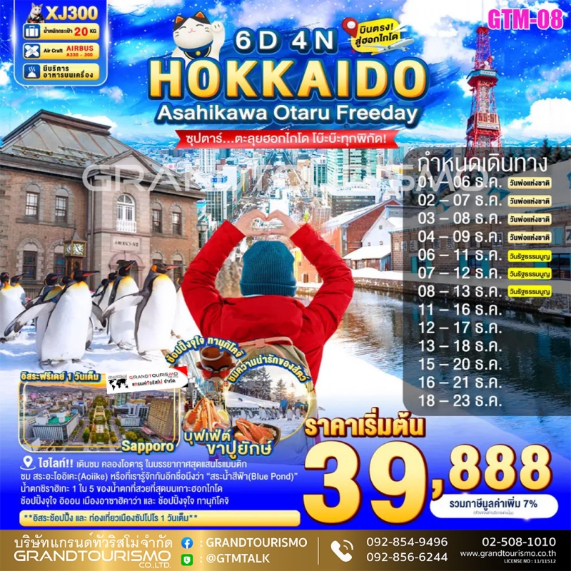ทัวร์ญี่ปุ่น ฮอกไกโด ฟุราโน่ นิงเกิ้ลเทอเรส อาซาฮิคาว่า บิเอะ น้ำตกชิราฮิเกะ สวนสัตว์อะซาฮิยาม่า ย่านซูซูกิโนะ ซัปโปโร โอตารุ (อิสระ1วัน) 6วัน4คืน ธ.ค.68