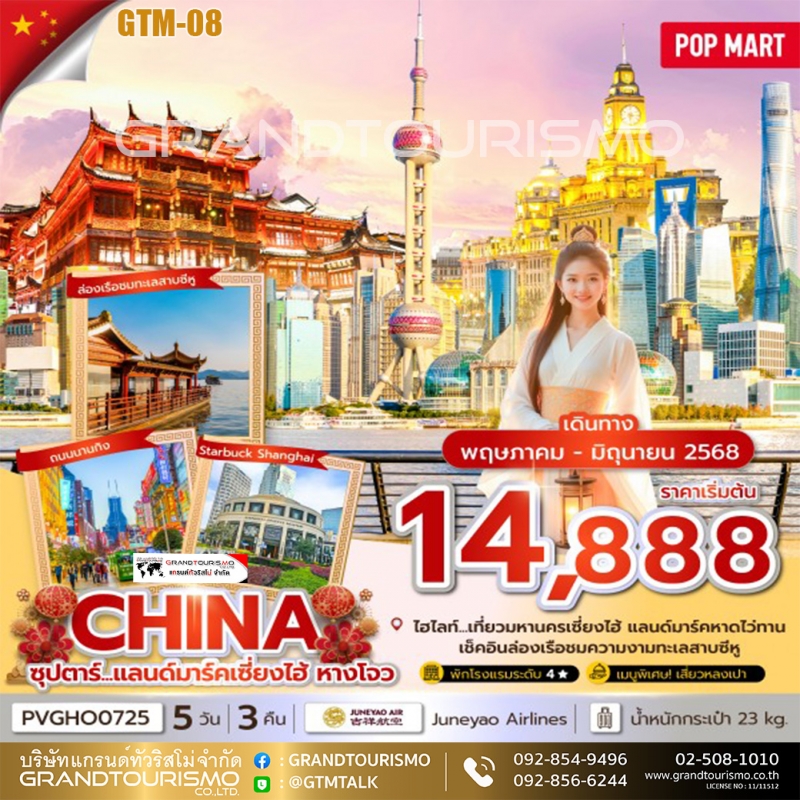 ทัวร์จีน เซี่ยงไฮ้ หางโจว ล่องเรือชมทะเลสาบซีหู เมืองโบราณจูเจียเจียว หาดไว่ทาน (อิสระ1วัน) 5วัน3คืน พ.ค.-มิ.ย.68