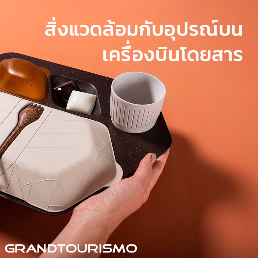 PriestmanGoode สตูดิโอออกแบบอุตสาหกรรมทำการออกแบบถาดอาหารและอุปกรณ์อาบน้ำจากเมล็ดกาแฟบดและแกลบจากข้าว เพื่อมาแทนที่ผลิตภัณฑ์ที่ทำจากพลสาติกที่ใช้ได้ครั้งเดียว จากพัฒนาแนวคิดครั้งนี้เป็นส่วนหนึ่งของนิทรรศการใหม่ที่ London’s Design Museum ที่มีชื่อว่า “ Get Onboard : Reduce. Reuse. Rethink. " PriestmanGoode ได้ออกแบบองค์ประกอบต่างๆของบริการห้องโดยสารบนเครื่องบินเพื่อลดปริมาณขยะพลาสติกที่ผลิตขึ้น