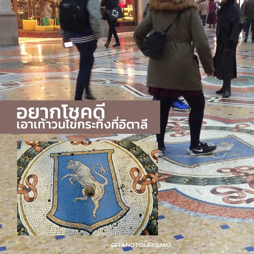 Milan - The Galleria Vittorio Emmanuele II ที่นี่จะมีแต่ร้านหรู แบรนด์ดังระดับโลกค่ะเเต่ที่นำมาเล่าไม่ใช่เเบรนด์เนมเเต่อย่างใดที่น่าสนุกก็คือ ตรงแถวๆกลางแยกที่มีร้านหลุยส์ เราจะเห็นคนมุงๆกัน เดินเข้าไปดู ก็จะเห็นโมเสกรูปกระทิง แล้วก็แต่ละคนก็ผลัดเปลี่ยนเวียนไปเอาส้นเท้าตัวเองเหยียบ "ไข่"กระทิง พร้อมหมุนวนไปด้านหลัง 3 ที จากที่ถามๆมาก็ได้ความว่า ใครทำอย่างนี้แล้วจะโชคดี ให้ขอพรในใจเเล้วหมุนเลยจ้า เจ้ากระทิงโดนเหยียบ..ซะเป็นหลุมเลย