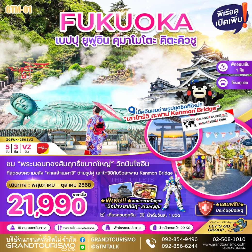 ทัวร์ญี่ปุ่น ฟุกุโอกะ เบปปุ ยูฟูอิน คุมาโมโตะ คิตะคิวชู วัดนันโซอิน กันดั้มพาร์ค 5 วัน 3 คืน พ.ค.-ต.ค. 68