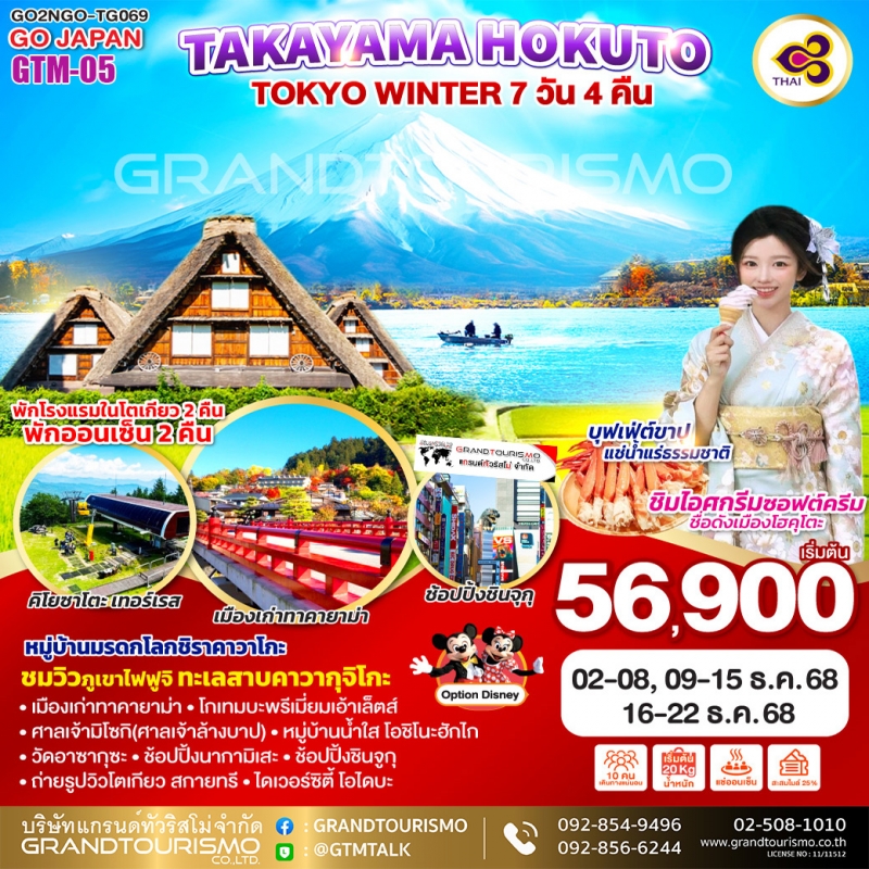 ทัวร์ญี่ปุ่น นาโกย่า ชิราคาวาโกะ ทาคายาม่า ทะเลสาบคาวากุจิโกะ โตเกียว โอชิโนะฮักไก (อิสระ1วัน) 7วัน4คืน ธ.ค.68