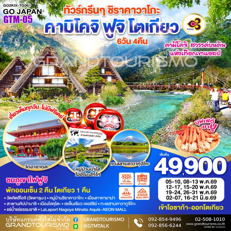 ทัวร์ญี่ปุ่น โอซาก้า โตเกียว ฟูจิ ชิราคาวาโกะ คามิโคจิ ภูเขาไปฟูจิชั้น5 คาวากูจิโกะ หมู่บ้านน้ำใส 6วัน4คืน พ.ค.-มิ.ย.69