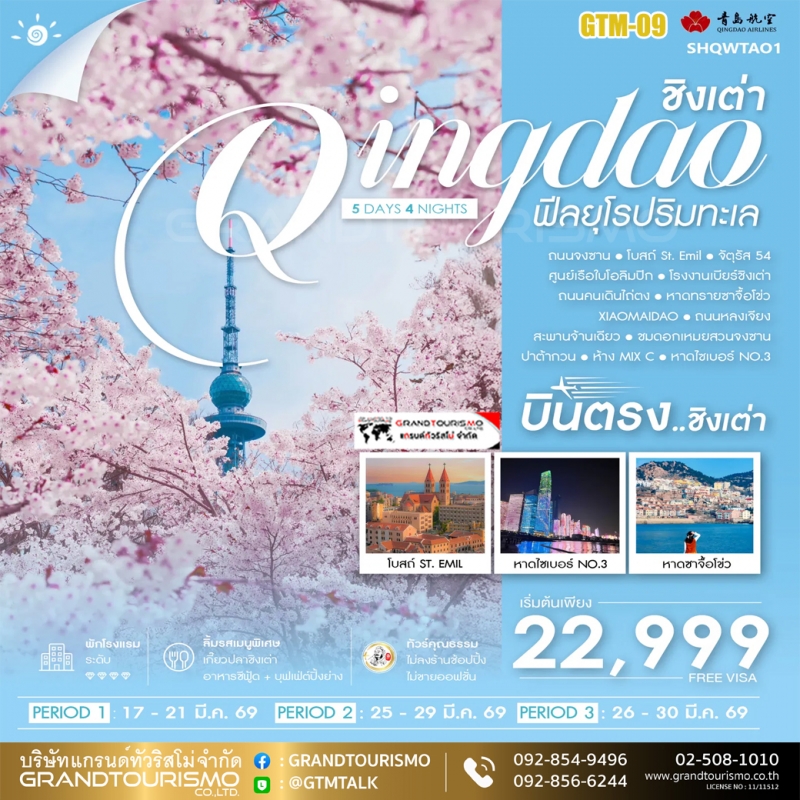 ทัวร์จีน ชิงเต่า ไม่ลงร้าน ชมดอกเหมย โรงงานเบียร์ชิงเต่า หาดทรายซาจื้อโข่ว จตุรัส 54 ถนนหลงเจียง สะพานจ้านเฉียว 5 วัน 4 คืน มี.ค. 69