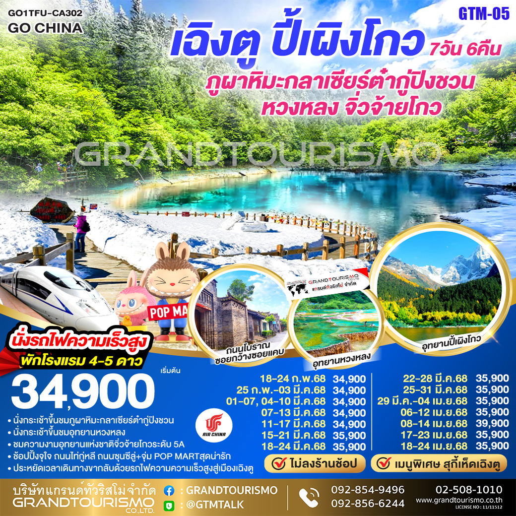 ทัวร์จีน เฉิงตู ปี๊เผิงโกว ต๋ากู่ปิงชวน ภูเขาหิมะตำคู่การ์เซีย วัดต้าฉือ (รวมค่ากระเช้าไฟฟ้าแล้ว) 6วัน4คืน ก.ย.-ต.ค.69 BY FD