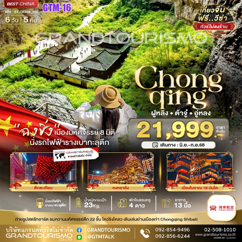 ทัวร์จีน ฉงชิ่ง ฝูหลิง ต้าจู๋ อู่หลง (ไม่ลงร้าน) 6วัน5คืน มิ.ย.-ก.ย.68