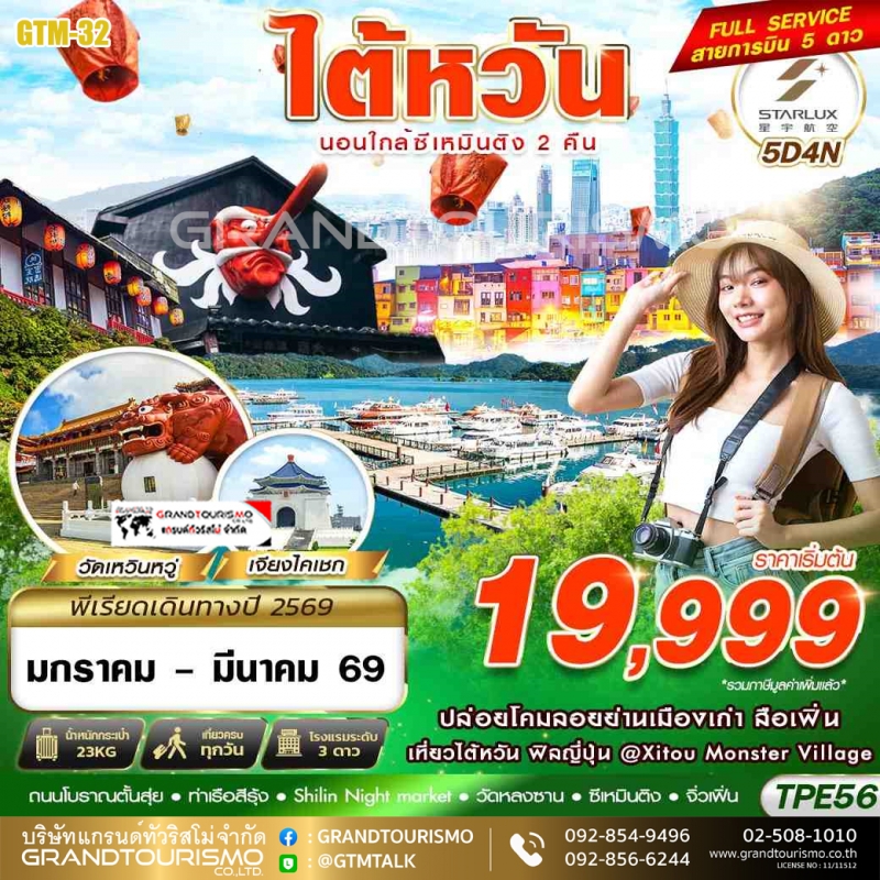 ทัวร์ไต้หวัน ไถจง ไทเป ทะเลสาบสุริยันจันทรา วัดเหวินหวู่ หมู่บ้านปีศาจซีโถว ฟ่งเจี๋ยไนท์มาร์เก็ต หมู่บ้านโบราณจิ่วเฟิ่น เจียง ไคเชก ท่าเรือสีรุ้ง ซีเหมินติง 5 วัน 4 คืน ม.ค.-มี.ค. 69
