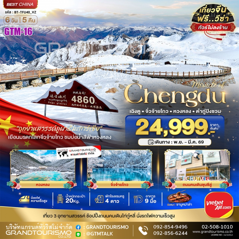 ทัวร์จีน เฉิงตู จิ่วจ้ายโกว หวงหลง ต๋ากู่ปิงชวน นั่งรถไฟความเร็วสูง (ไม่ลงร้าน) 6วัน5คืน พ.ย.68-มี.ค.69
