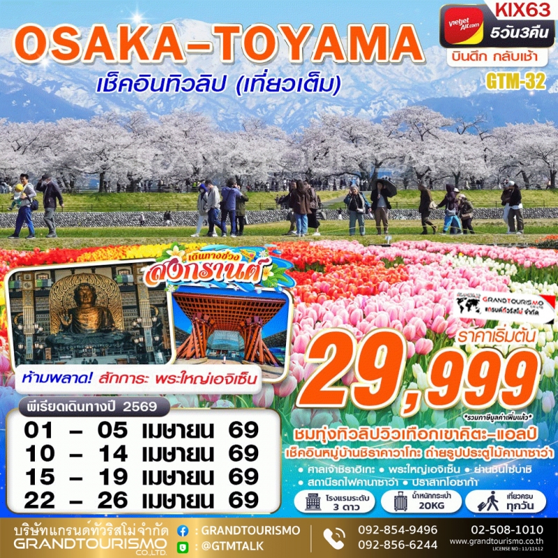 ทัวร์ญี่ปุ่น โอซาก้า ศาลเจ้าชิราฮิเกะ พระใหญ่เอจิเซ็น สถานีรถไฟคานาซาว่า โทยามะ ทุ่งทิวลิปวิวเทือกเขาคิตะ ชิราคาวาโกะ ปราสาทโอซาก้า 5 วัน 3 คืน เม.ย. 69