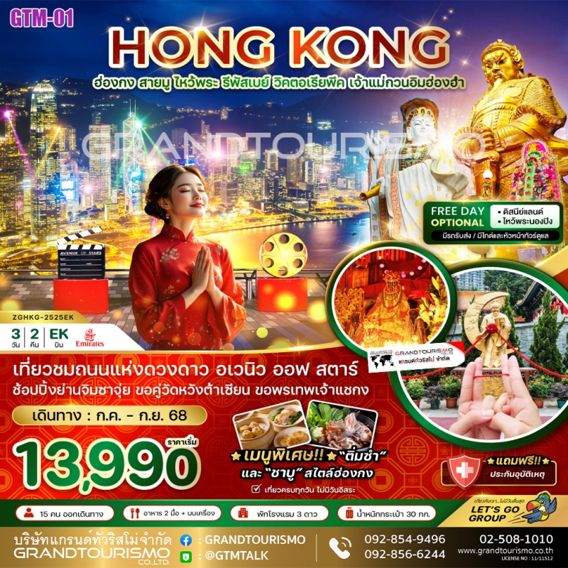 ทัวร์ฮ่องกง รีพัสเบย์ วิคตอเรียพีค วัดแชกงหมิว วัดหวังต้าเซียน เจ้าแม่กวนอิมฮ่องฮำ (อิสระ1วัน) 3วัน2คืน ก.ค.-ก.ย.68