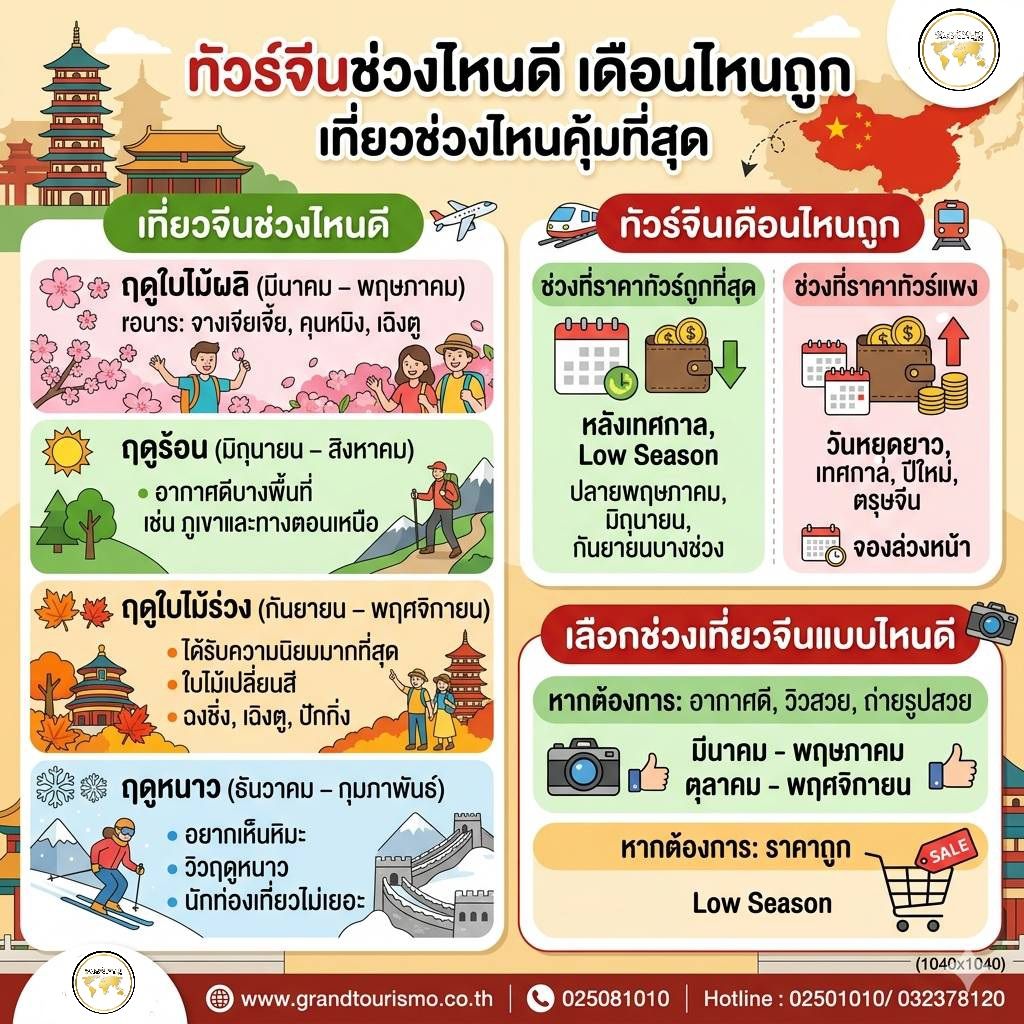 ประเทศจีนเป็นประเทศที่สามารถเที่ยวได้ตลอดทั้งปี แต่ช่วงเวลาที่เหมาะสมและราคาทัวร์จะแตกต่างกันไปในแต่ละฤดูกาล