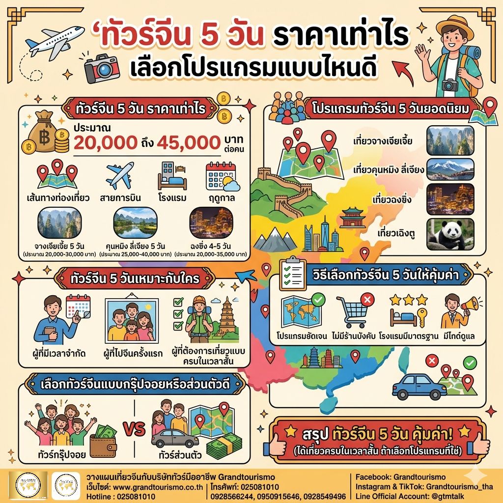 หลายคนที่กำลังวางแผนเดินทางมักมีคำถามว่า ทัวร์จีน 5 วัน ราคาเท่าไร และควรเลือกโปรแกรมแบบไหนให้คุ้มค่า