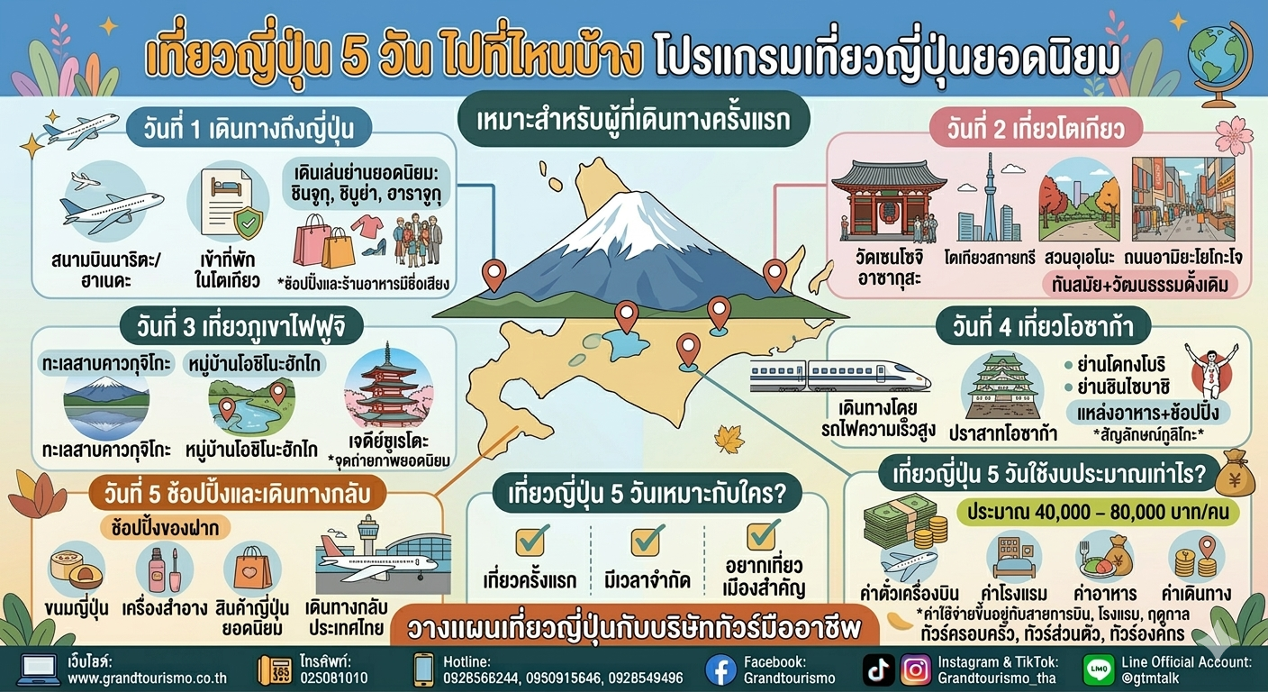 บทความนี้จะแนะนำโปรแกรมเที่ยวญี่ปุ่น 5 วัน ที่เหมาะสำหรับผู้ที่เดินทางครั้งแรก