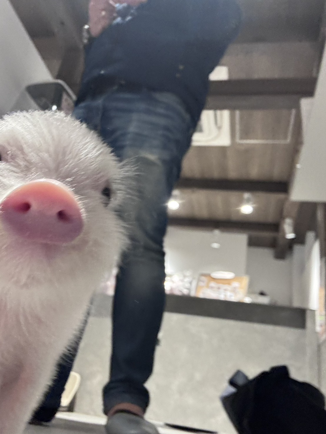 - น้องหมูมักปีนขึ้นตัก ทำให้ได้ภาพและวิดีโอที่น่าสนใจ