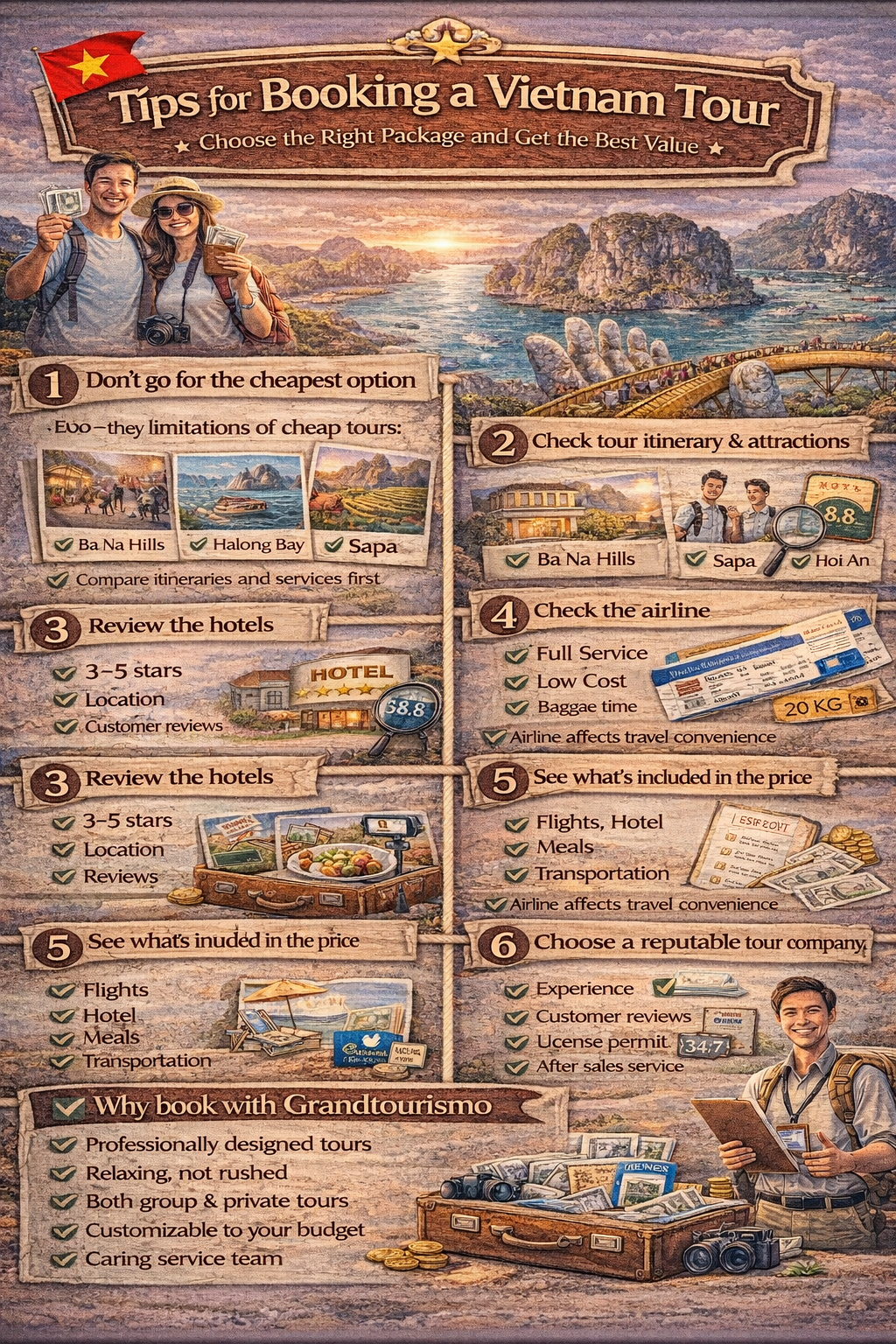 ก่อนตัดสินใจจองทัวร์เวียดนาม หลายคนมักดูแค่ราคา แต่ความจริงแล้วการเลือกทัวร์ที่ดีควรพิจารณาหลายปัจจัย เช่น โปรแกรมเที่ยว โรงแรม สายการบิน และเงื่อนไขต่าง ๆ Grandtourismo สรุปข้อควรรู้ก่อนจองทัวร์เวียดนาม เพื่อช่วยให้คุณเลือกทัวร์ได้อย่างคุ้มค่าและเหมาะกับการเดินทางมากที่สุด