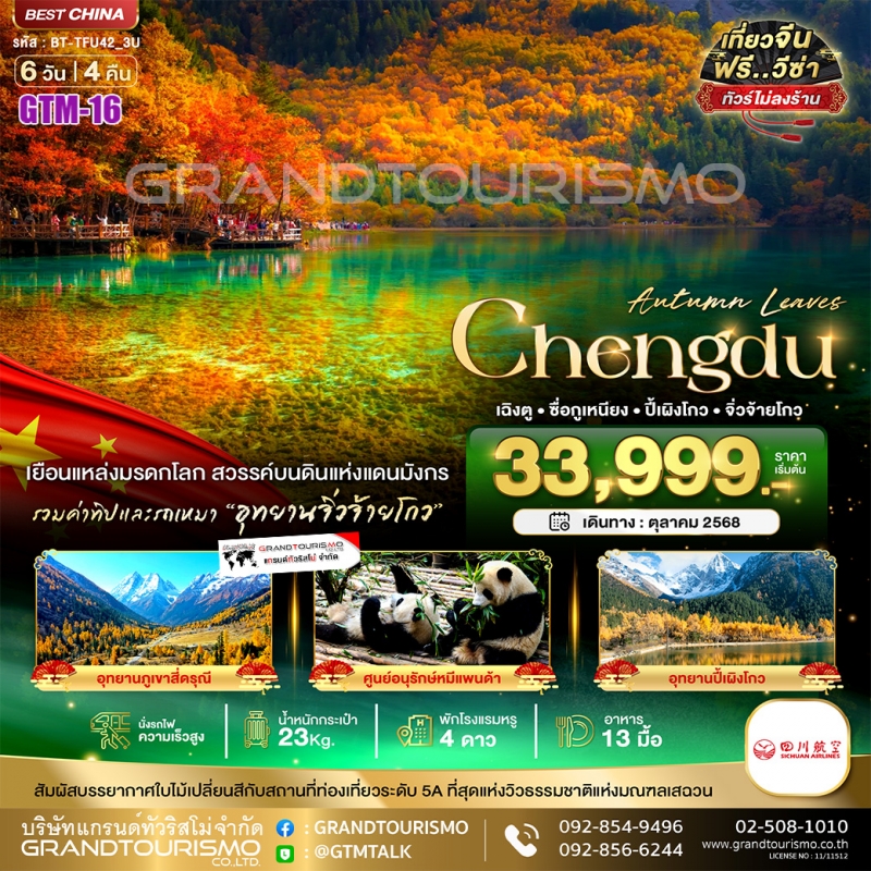 ทัวร์จีน เฉิงตู ไม่ลงร้าน จิ่วจ้ายโกว รถไฟความเร็วสูง ภูเขาสี่ดรุณี ปี้เผิงโกว ลำธารสีฟ้า อุทยานซวงเฉียวโกว วัดต้าฉือ ห้าง IFS หมีแพนด้ายักษ์ปีนตึก 6 วัน 5 คืน ต.ค. - ธ.ค. 69