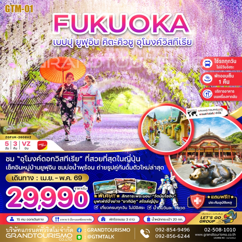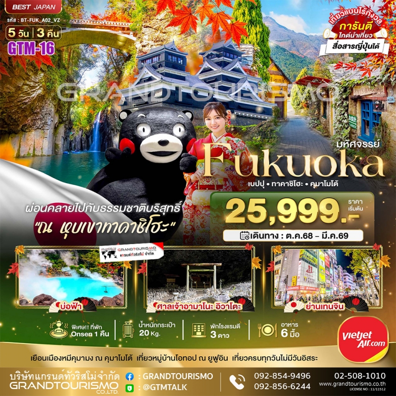 เดินทางสู่เกาะทางใต้ของญี่ปุ่นกับ ทัวร์ฟุกุโอกะ เมืองที่ผสมผสานความทันสมัยเข้ากับธรรมชาติอย่างลงตัว พบกับบรรยากาศอันเงียบสงบของหมู่บ้านยูฟุอิน และความมหัศจรรย์ของบ่อน้ำพุร้อนที่เมืองเบปปุ ให้การพักผ่อนครั้งนี้สมบูรณ์แบบที่สุดกับเส้นทางที่ Grandtourismo คัดสรรมาเพื่อคุณ