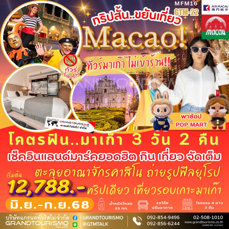 ทัวร์มาเก๊า ไม่ลงร้าน พักมาเก๊า โบสถ์เซนต์พอล ศาลเจ้านาจา เซนาโด้สแควร์ วัดเจ้าแม่กวนอิม วัดอาม่า เวเนเชี่ยน 3 วัน 2 คืน พ.ค.-มิ.ย. 68