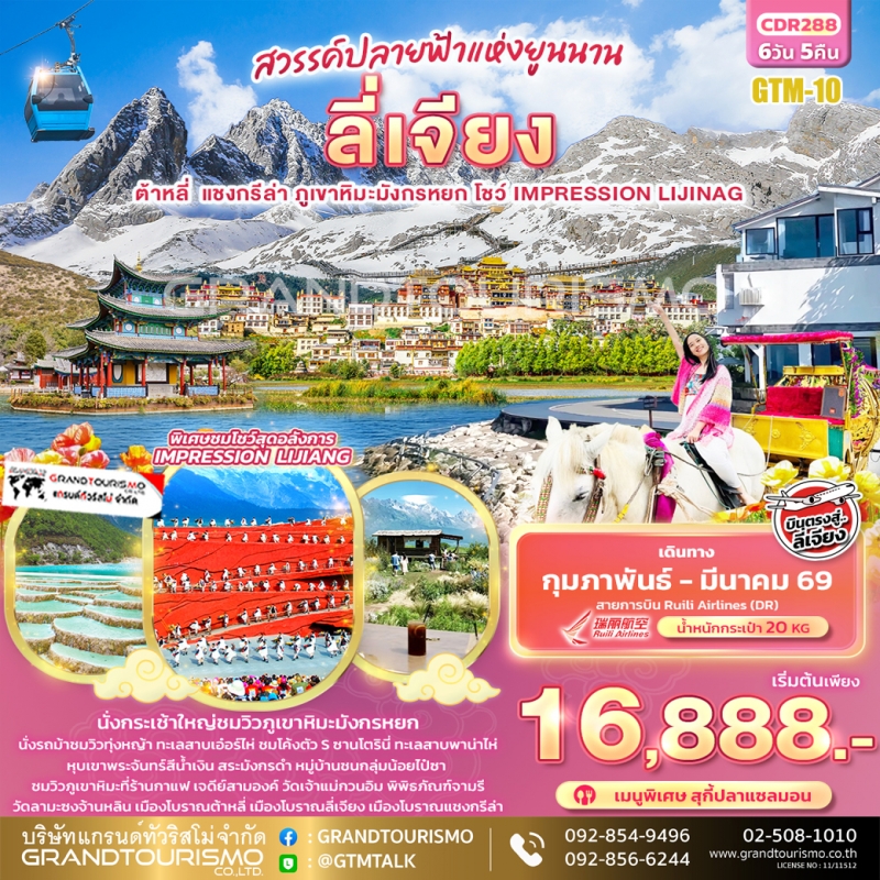 ทัวร์จีน ลี่เจียง ต้าหลี่ แชงกรีล่า ช่องแคบเสือกระโจน สระมังกรดำ ภูเขาหิมะมังกรหยก โชว์ IMPRESSION LIJIANG หุบเขาสีน้ำเงิน 6 วัน 5 คืน ธ.ค. 68 - ม.ค. 69