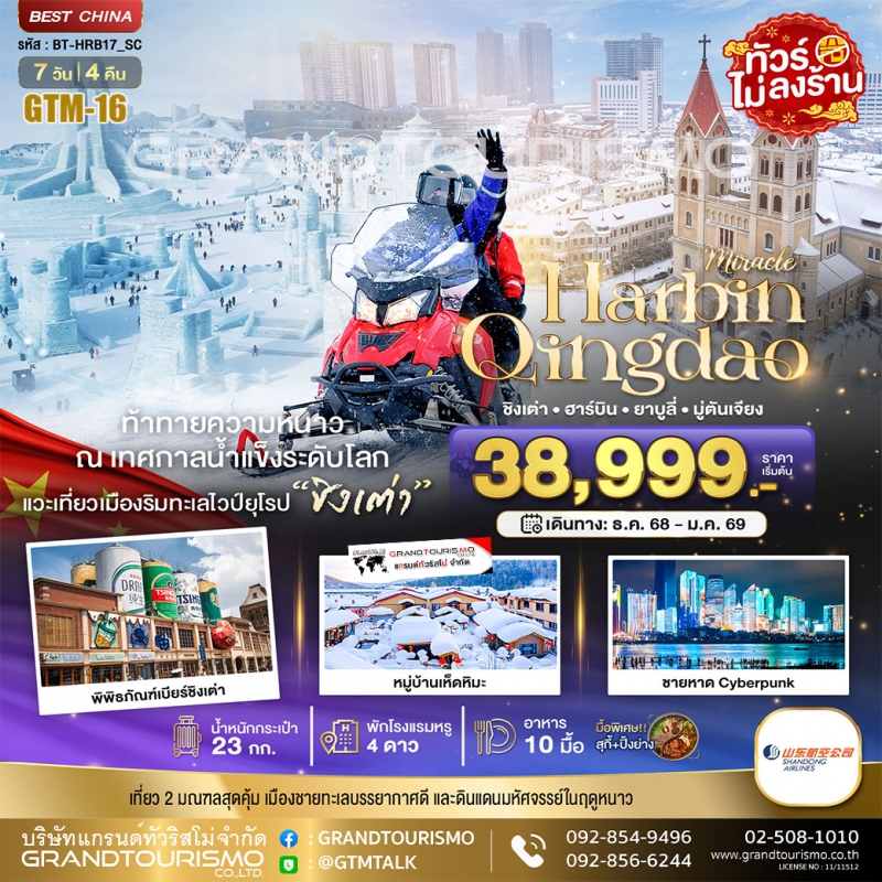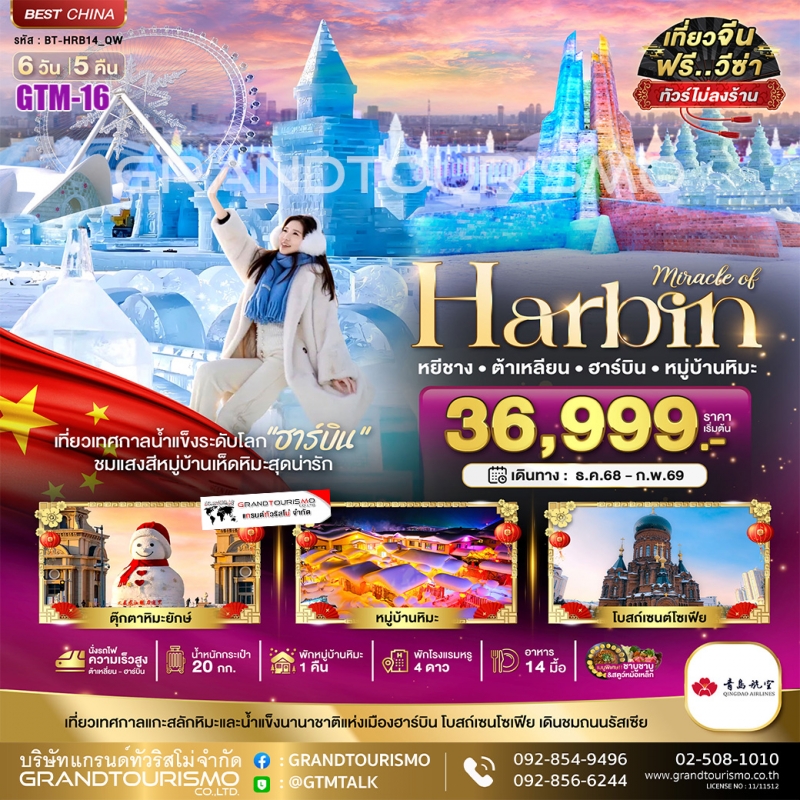 ทัวร์จีน ฮาร์บิน ชิงเต่า ยาบูลี่ มู่ตันเจียง หมู่บ้านหิมะ (ไม่ลงร้าน) 7วัน4คืน ธ.ค.68-ม.ค.69