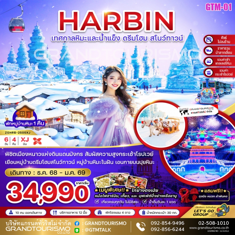 ทัวร์จีน ฮาร์บิน หมู่บ้านหิมะ ดรีมโฮม ลานสกียาปูลี่ เทศกาลแกะสลักน้ำแข็ง เกาะพระอาทิตย์ นั่งรถไฟความเร็วสูง (ไม่ลงร้าน) 6วัน5คืน ธ.ค.68-ก.พ.69