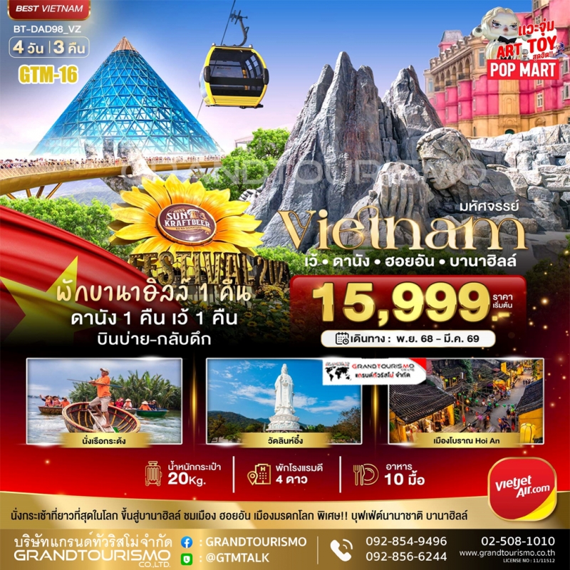 ทัวร์เวียดนาม (ไม่ลงร้าน) ดานัง ฮอยอัน พักบานาฮิลส์ หมู่บ้านกั๊มทาน ล่องเรือกระด้ง พระพุทธรูปหลินอึ๋ง 4วัน3คืน เม.ย.-ก.ย.69 BY VN
