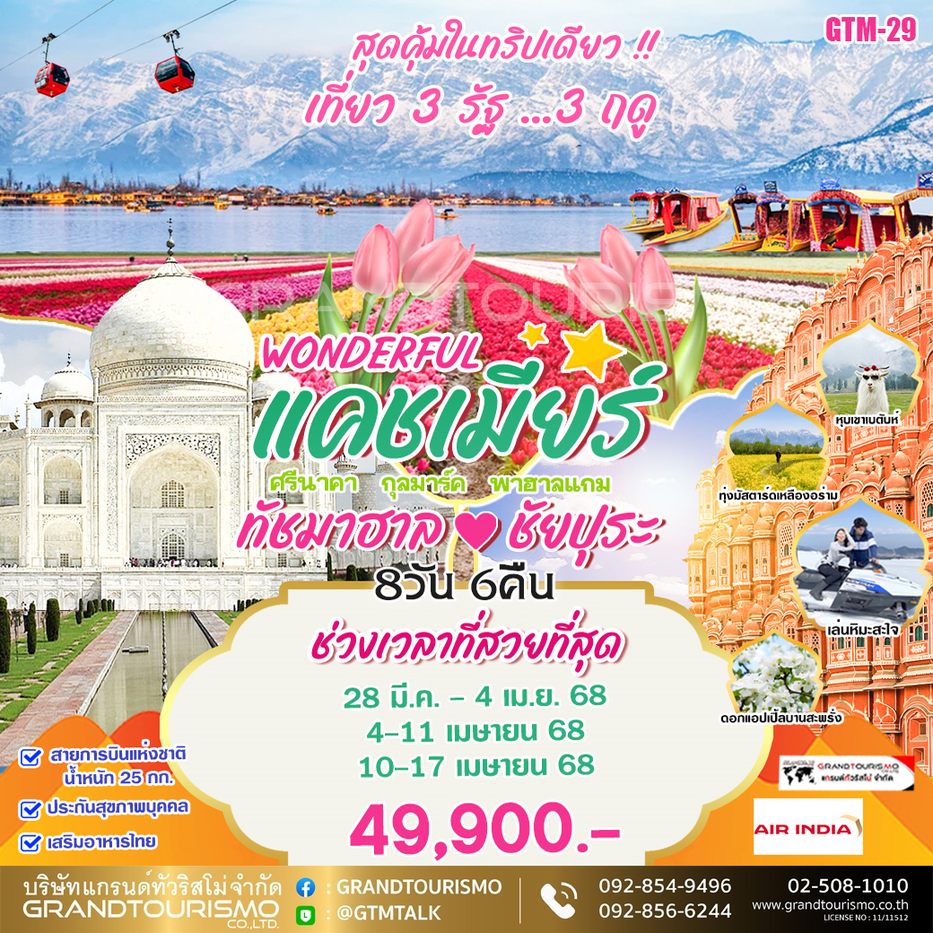 ทัวร์อินเดีย แคชเมียร์ ชัยปุระ ศรีนาคา กุลมาร์ค ทัชมาฮาล พาฮาลแกม (บินภายใน) 8วัน6คืน มี.ค.-เม.ย.68