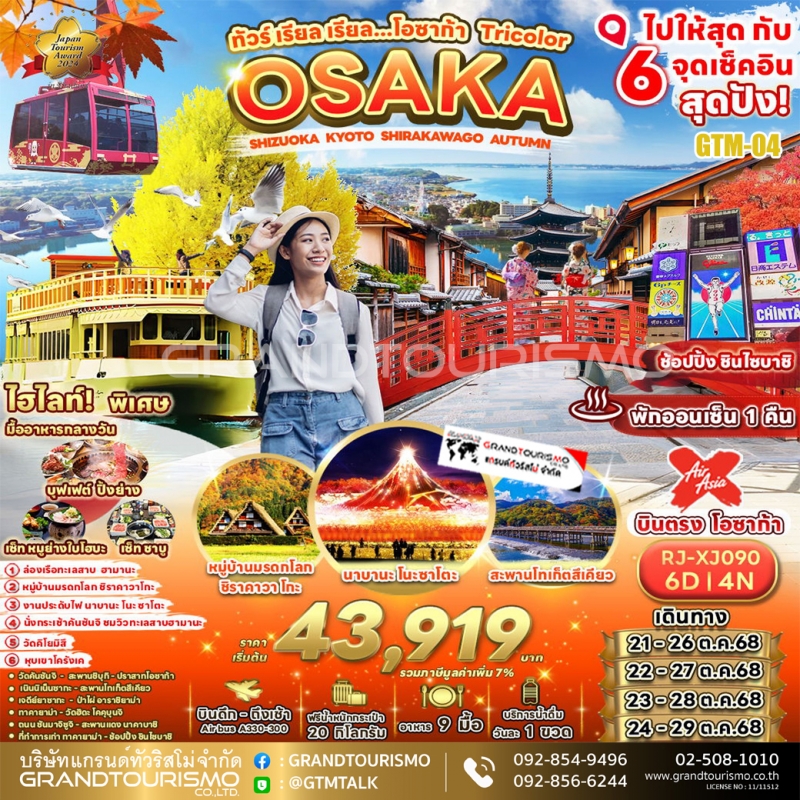 ทัวร์ญี่ปุ่น โอซาก้า เกียวโต ปราสาทโอซาก้า วัดคิโยมิสึ ป่าไผ่อาราชิยาม่า สะพานโทเก็ตสึเคียว แช่ออนเซ็น โครังเค งานประดับไฟ ชิราคาวาโกะ 6 วัน 4 คืน ต.ค.68